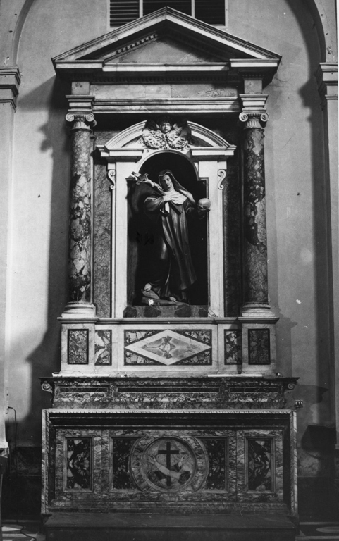 paliotto composto da specchiature rettangolari ai lati esterni e circolare al centro con braccia incrociate e croce; piedritti sostengono due colonne lisce concluse da capitello ionico raccordate da timpano triangolare al centro entro nicchia statua