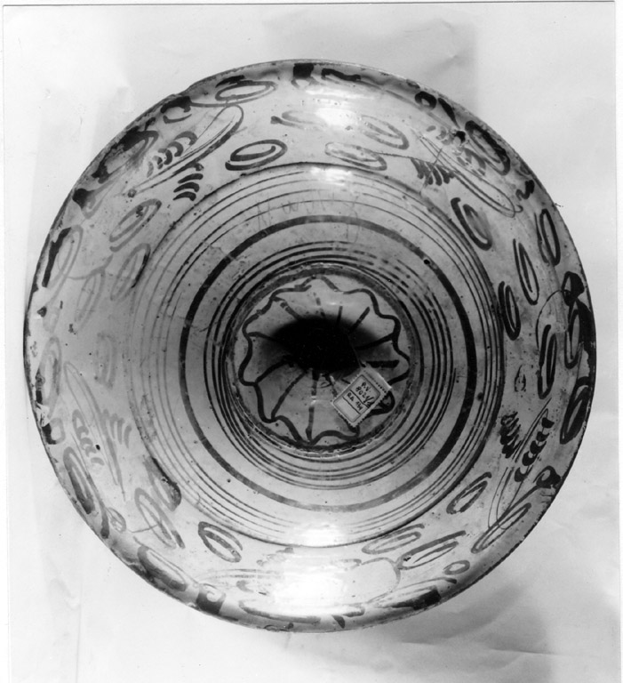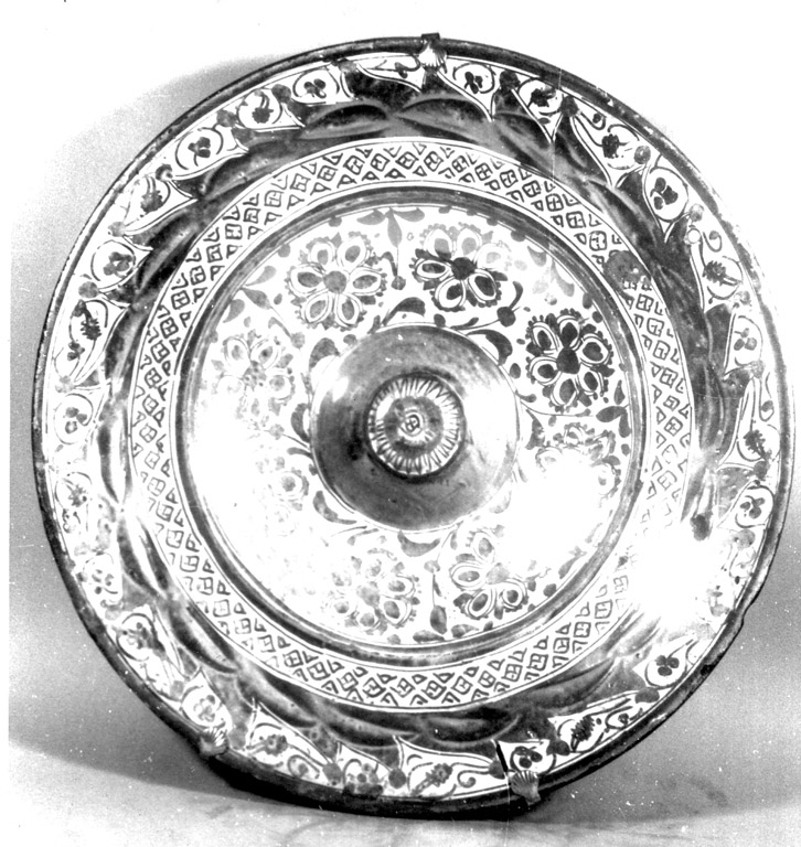 Piatto da pompa di grandi dimensioni con larga tesa, decorato in oro con riflessi metallici (lustro) composta nella tesa da un motivo floreale a dente e da una fascia con motivo a piccoli rombi; nel cavo otto fiori a sei petali con rametti e foglie, al centro un fiore a stella. nel retro motivo del sei con piume e fili concentrici, al centro un piccolo rosone