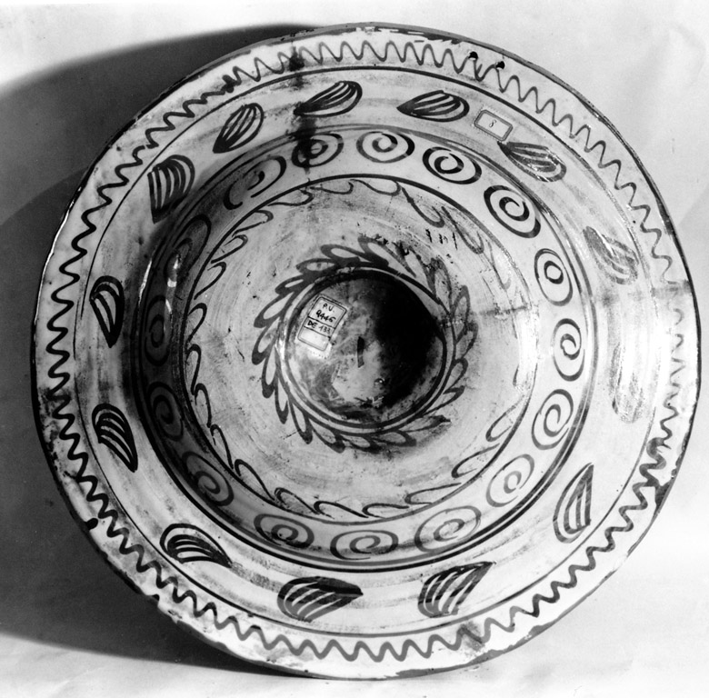 - NOTIZIE STORICO CRITICHE Questo piatto è collocabile fra gli esemplari riferibili alla "serie aragonese", come è noto, stilisticamente connessa a quella valenciana, ma non priva di una sua propria originalità espressiva. Da notare che è caratteristica della ceramica aragonese una ariosa e ben equilibrata distribuzione della decorazione che in genere si presenta abbastanza semplificata