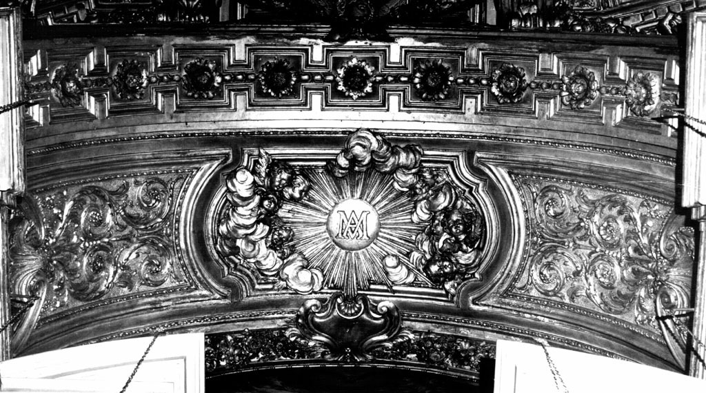 si compone di tre fasce: la prima ha una serie di rosoni entro cassettoni; quella centrale più ampia con monogramma mariano entro raggiera, nuvole e teste d' angelo; la terza, che incornicia la lunetta, è ornata da motivi floreali ed ha al centro una cartella mistilinea con conchiglia in alto