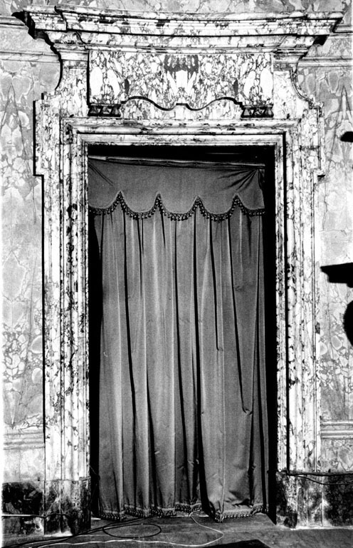 lo stipide semplice sui lati si articola nella parte superiore dove alla cornice si sovrappone un pannello marmoreo leggermente sagomato che termina con un cornicione aggettante