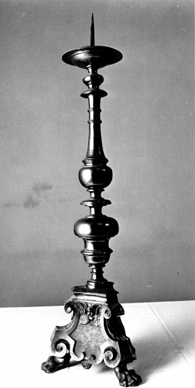 base a sezione triangolare su piedi leonini; nodo a vaso sagomato; fusto a balausto; piattello e puntale. Decorazione a volute e testa cherubica al centro di ogni faccia