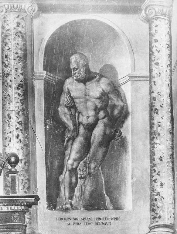 - NOTIZIE STORICO CRITICHE Il personaggio raffigurato è Ercole che, come si legge dall' iscrizione, dopo aver edificato il castello sul colle del Duomo, diede alla città di Viterbo lo stemma raffigurante il leone da lui ucciso nella Selva Nemea