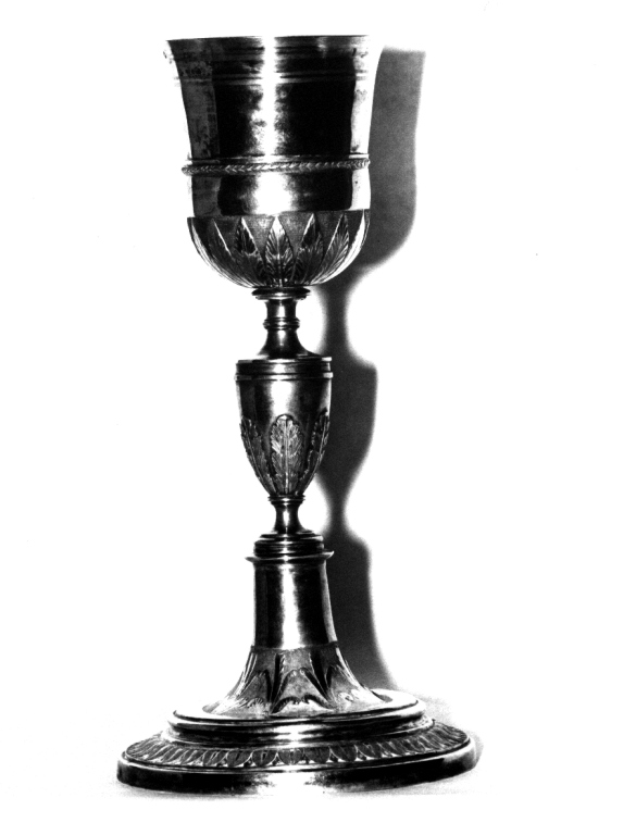 Calice con piede a base circolare, fusto con nodo centrale a ghianda ornato con foglie d'acanto, sottocoppa decorata a sbalzo con foglie nervate e allungate. Coppa rifinita da un cerchio a spina di pesce