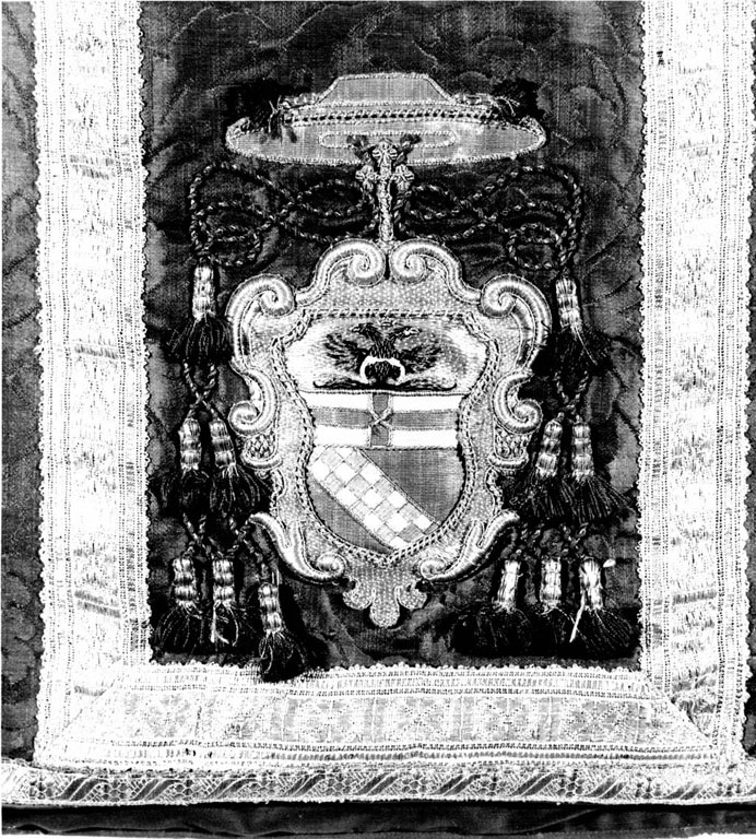 su damasco di seta rosso, galloni applicati in oro su accia di seta ritorta, stemma a ricamo applicato in oro e fili di seta