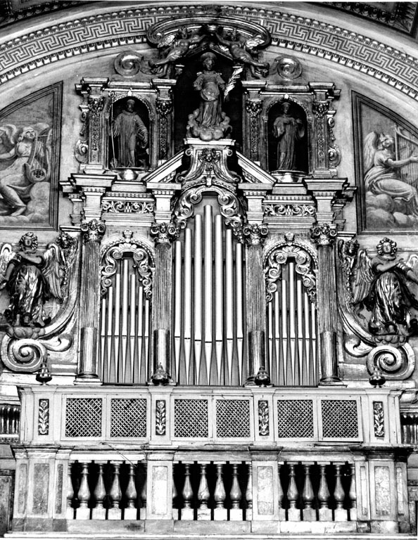 due mensole ornate con due teste di cherubini sorreggono una balaustra marmorea caratterizzata da un alternarsi di lesene e balaustri