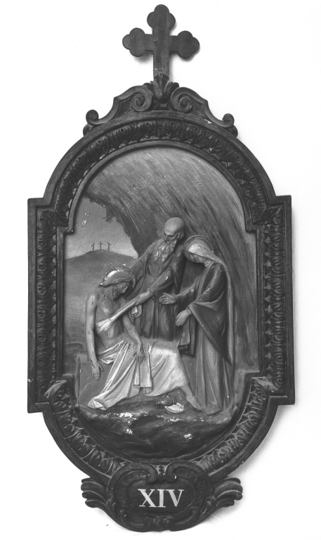 Personaggi: Gesù; Madonna. Figure maschili: un uomo. Architetture: edifici cittadini. Oggetti: croce