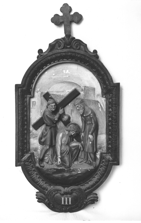 Personaggi: Gesù. Figure maschili: due uomini. Architetture: edifici cittadini. Oggetti: croce