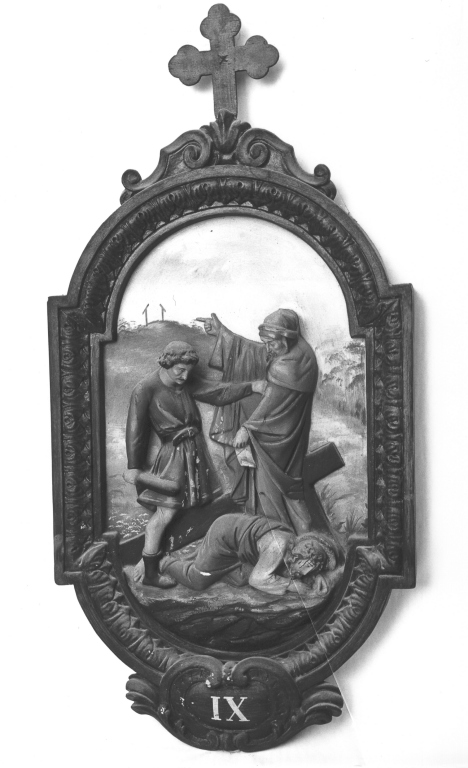 Personaggi: Gesù. Figure maschili: sacerdote; soldato. Paesaggi: altura del Golgota. Oggetti: croce