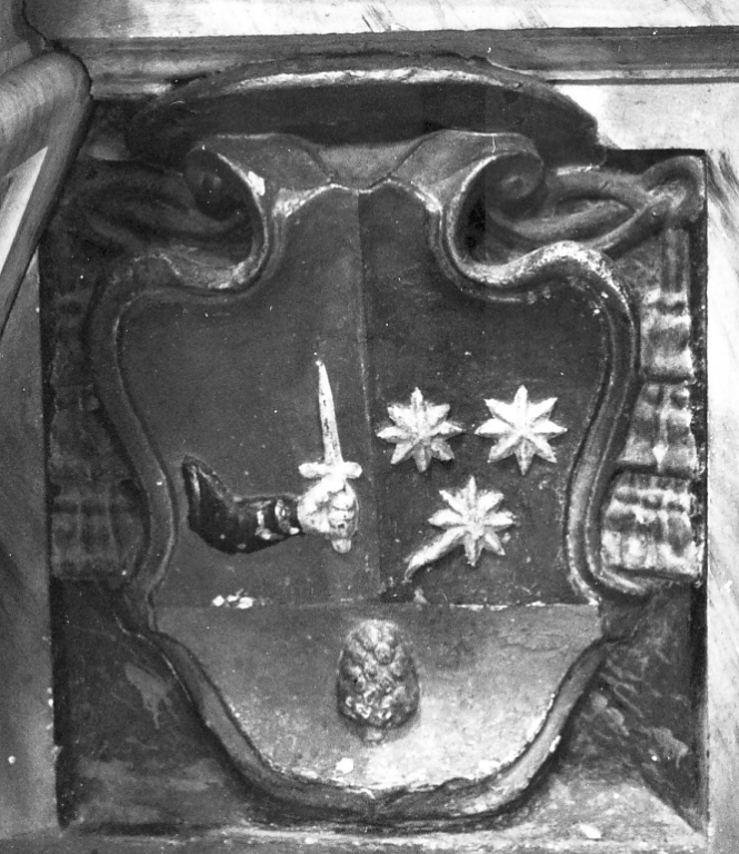 - NOTIZIE STORICO CRITICHE Lo stemma è riconoscibile come quello della famiglia de Pineri, cui sembra alludere il motivo della pigna, alla quale si dovette la nuova dedicazione dell'altare a S. Giuseppe intorno alla metà del Seicento. Identico a quello visibile nell'angolo inferiore della tela posta al di sopra dell'altare, lo stemma fa anche "pendant" con quello al lato opposto della mensa, in tutto simile non fosse altro che per il motivo delle due braccia incrociate, simbolo dei conventuali, aggiunto al di sotto del cappello cardinalizio: anche per questo sembra verosimile riferire i due stemmi ai membri della famiglia de Pineri che ricoprirono alte cariche ecclesiastiche: Angelo, vescovo di Marsico dal 1656, morto nel 1671 (cfr. Hierarchia Catholica, vol. IV, p. 233), e Vincenzo, membro dell'Ordine dei Minori Conventuali di S. Francesco, vescovo di Polignano dal 1650, morto nel 1672 (cfr. F. Ughelli, Italia sacra, t. VII, coll. 758-759; G. Moroni, Dizionario di erudizione storico-ecclesiastica, vol. LIV, p. 33). I due stemmi, che dovevano avere una collocazione simile all'attuale, da non ritenere comunque l'originaria in quanto gli altari hanno subito un radicale rifacimento alla fine dello scorso secolo, risalgono dunque ai primi decenni della seconda metà del Seicento, e questa datazione può essere ritenuta valida anche per la commissione della tela d'altare (cfr. scheda 1200210318)