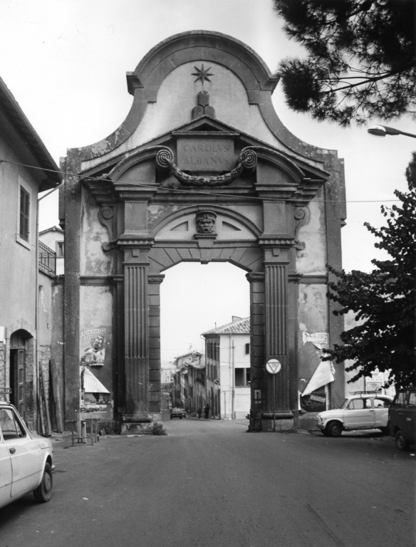 - NOTIZIE STORICO CRITICHE E' una delle targhe delle porte d'ingresso al paese eseguita come informa la targa, dal principe Albani. Carlo Albani era figlio di Orazio (fratello di Clemente XI) e fratello dei cardinali Annibale e Alessandro. La porta, l'unica settecentesca sopravvissuta, è certo posteriore al 1715, epoca in cui gli Altemps vendettero la Rocca ad i diritti feudali su Soriano agli Albani