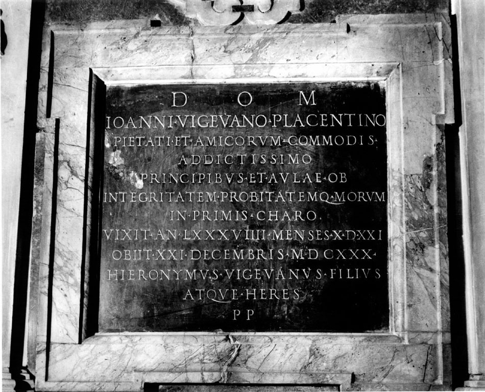 - ISCRIZIONI sotto il busto del defunto - D O M / IOANNI VIGEVANO PLACENTINO/ PIETATI ET AMICORVM COMMODIS/ ADDICTISSIMO/ PRINCIPIBVS ET AVLAE OB/ INTEGRITATEM PROBITATEMQVE MORVM/ IN PRIMIS CHARO/ VIXIT AN LXXXVIIII MENSES X D XXI/ OBIIT DECEMBRIS MDCXXX/ HIERONYMVS VIGEVANVS FILIVS/ ATQVE HERES/ PP - lettere capitali - a solchi -