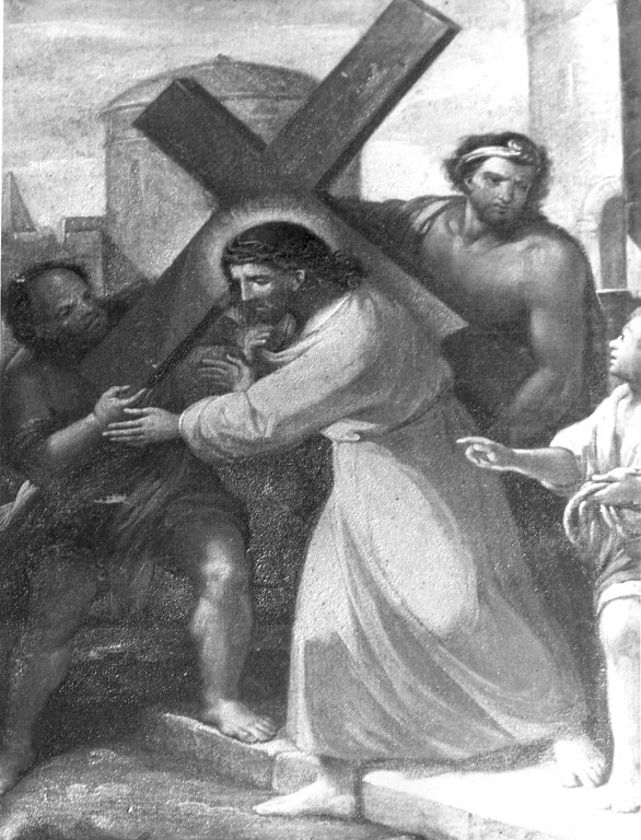 - NOTIZIE STORICO CRITICHE Con i caratteri propri della pittura devozionale, legata alla produzione della Via crucis, e pur appartenendo ad un filone provinciale, i dipinti in esame denotano nell'equilibrio compositivo e cromatico una certa qualità artistica che li inserisce pienamente nella cultura figurativa della seconda metà del XVIII secolo. Le composizioni sono studiate per dare risalto alle figure principali. Risaltano i rossi e gli azzurri delle vesti, mentre i toni degli sfondi sono bruni e più fumosi. Pochi i cenni di paesaggio