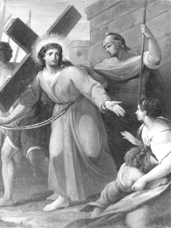 - NOTIZIE STORICO CRITICHE Con i caratteri propri della pittura devozionale, legata alla produzione della Via crucis, e pur appartenendo ad un filone provinciale, i dipinti in esame denotano nell'equilibrio compositivo e cromatico una certa qualità artistica che li inserisce pienamente nella cultura figurativa della seconda metà del XVIII secolo. Le composizioni sono studiate per dare risalto alle figure principali. Risaltano i rossi e gli azzurri delle vesti, mentre i toni degli sfondi sono bruni e più fumosi. Pochi i cenni di paesaggio