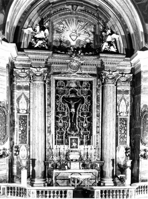 altare con edicola formata da una coppia di paraste e da una coppia di colonne a tutto tondo con scanalature, dotate di capitello ionico stilizzato. Al centro una cornice inquadra la pala, dove e' collocato il crocifisso. Una vasta trabeazione con dentellature sostiene il fastigio decorato con una coppia di angeli e un affresco, posto nell'edicola centrale, che finge una decorazione in stucco