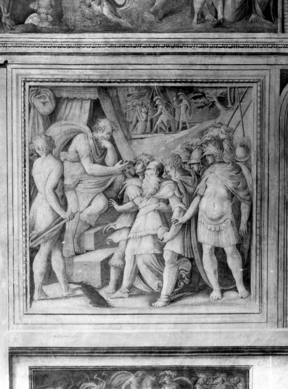 Personaggi: console Manlio. Figure: figure maschili; soldati. Oggetti: trono; tendaggio