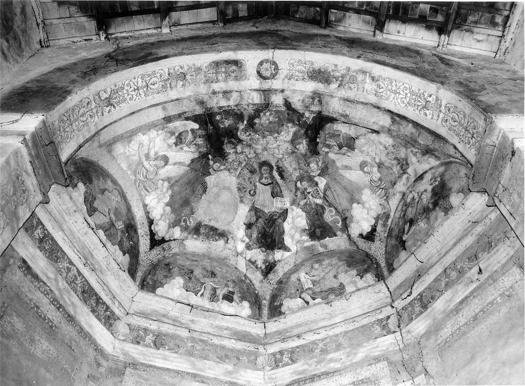 - NOTIZIE STORICO CRITICHE Gli affreschi, molto ridipinti, sono tipologicamente e stilisticamente riferibili ai primi decenni del XVI secolo. Il gusto per le finte architetture anticheggianti ed il modello iconografico del Cristo in gloria si richiamano ad opere realizzate a Roma dalla bottega del Peruzzi in S. Onofrio ed in S. Pietro in Montorio