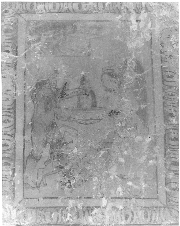 Una figura maschile a sinistra reca il piatto con la testa del Battista a Salomé, raffigurata sulla destra. Appena visibile il corpo del Battista, riverso. Le figure sono scarsamente leggibili e risultano inquadrate da una finta cornice dipinta