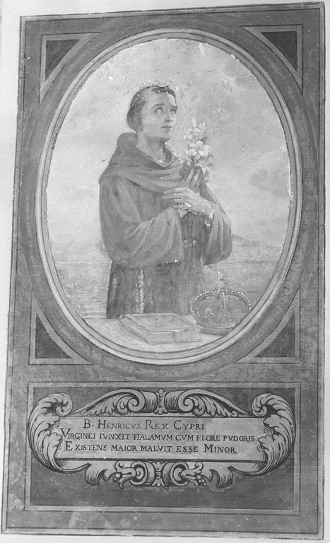 Il religioso è raffigurato in piedi e con gli occhi rivolti al cielo. Davanti a lui un libro e la corona ed in mano un giglio