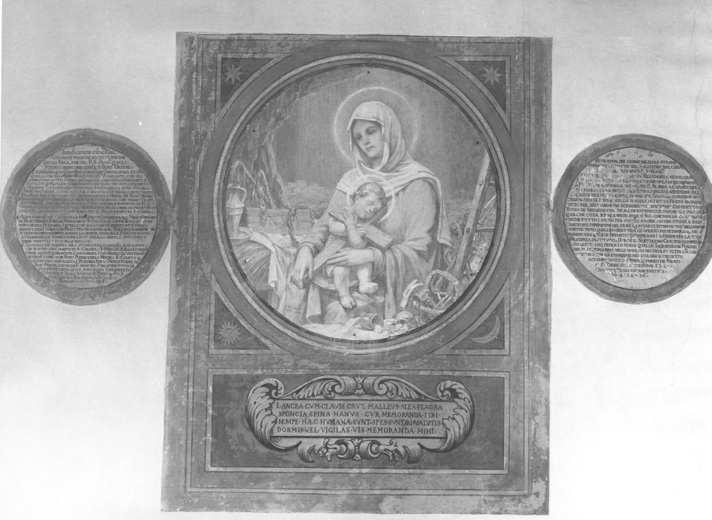 La Madonna ha in braccio il Bambino abbracciato alla croce. Tutto intorno simboli del martirio