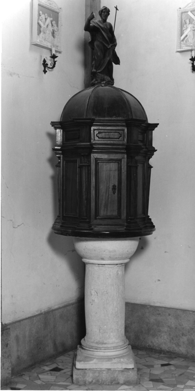 - NOTIZIE STORICO CRITICHE Nell'inventario della chiesa del 1728 è descritto un fonte battesimale con "un piedistallo fatto in cima ad uso di una conca tutto in pietra quale serve per sostenere il cuppolino", posto davanti alla porta della cella campanaria. Modificato nella collocazione forse nei restauri ottocenteschi della chiesa, il fonte, relativamente a sostegno e vasca, sembrerebbe corrispondere a quello descritto peraltro di incerta datazione per mancanza di elementi caratterizzanti un momento culturale definito. La lanterna attuale forse non corrispondente al "cuppolino" dell'inventario probabilmente ottocentesca è stata restaurata nel 1953 (com. orale di A. del Drago)