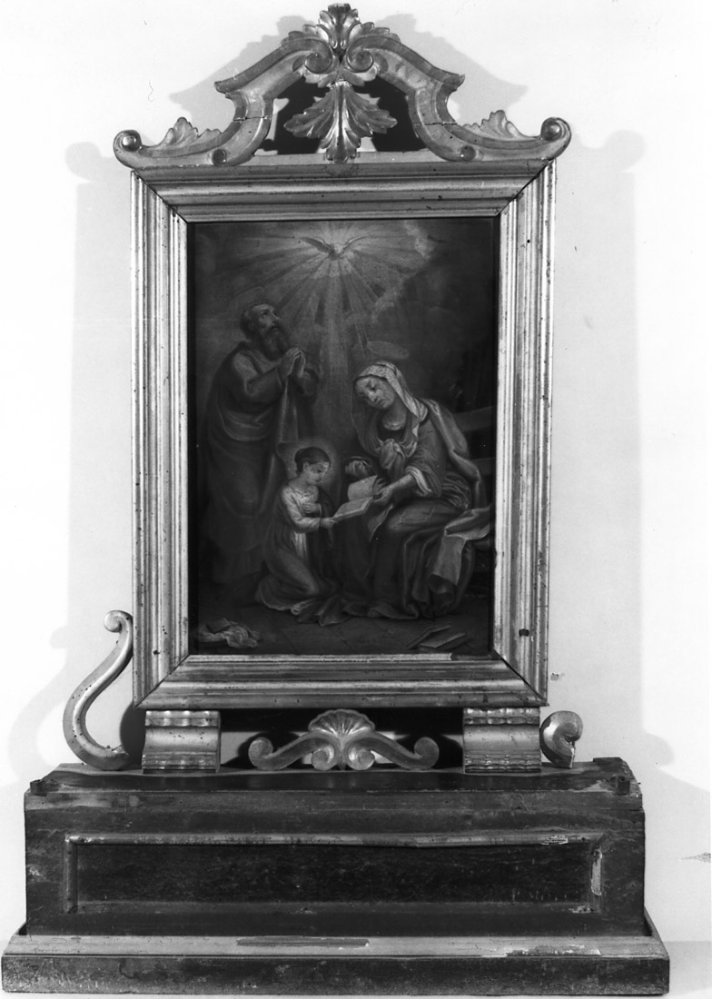 Altarolo dalla base rettangolare in legno dipinto a imitazione del marmo; cornice del dipinto di formato rettangolare affiancata in basso lateralmente da otivo a volute e al cenro da volute e palmetta; coronamento mistilineo con motivo a volute e elementi fitomorfi
