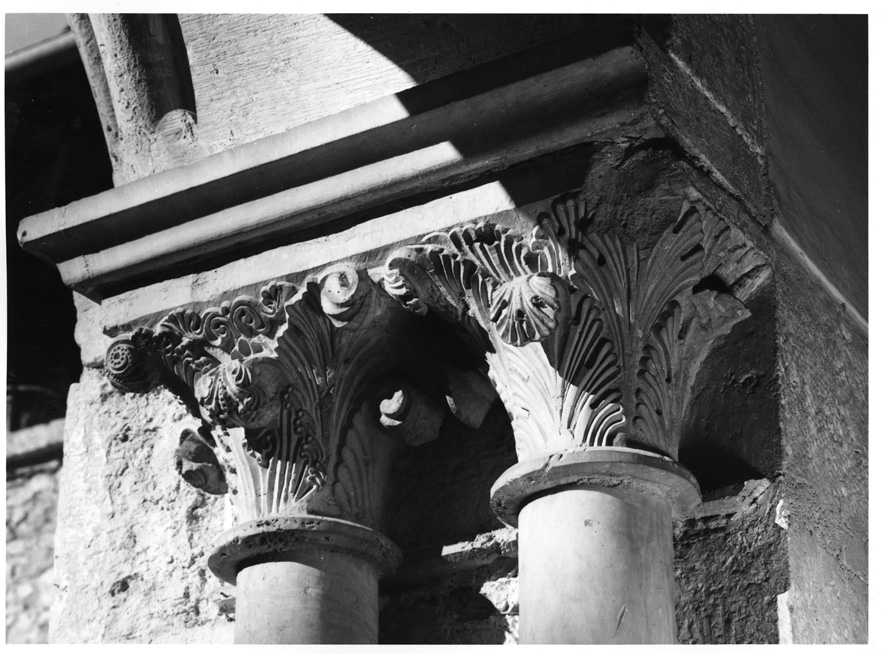 Coppia di colonnine con fusto in marmo e basi e capitelli in pietra calcarea. I capitelli, saldati alla struttura del muro contiguo, sono a fitto fogliame terminanti a caulicoli a forma di foglie e volute