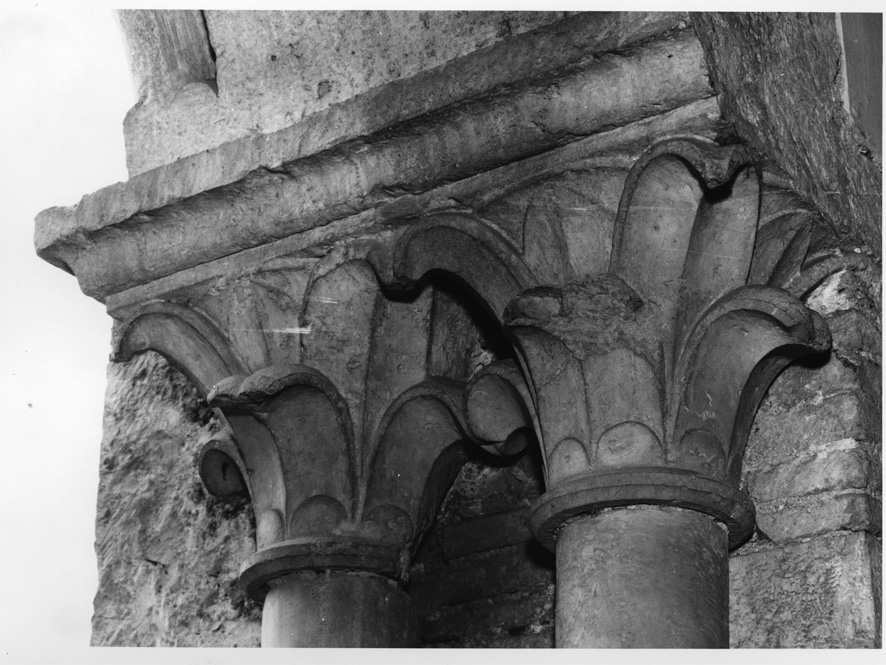 Coppia di colonnine con fusto in marmo e basi e capitelli in pietra calcarea. I capitelli scolpiti a tutto tondo (collocazione impropria rispetto alla costruzione originale) sono a doppio giro di foglie lisce con terminazioni ricurve