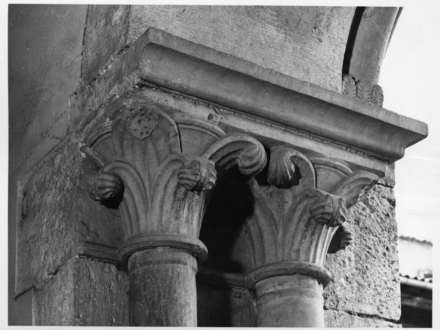 Coppia di colonnine con fusto in marmo e basi e capitelli in pietra calcarea. I capitelli sono a doppio giro di foglie scanalate terminanti a caulicoli a forma di foglie e volute