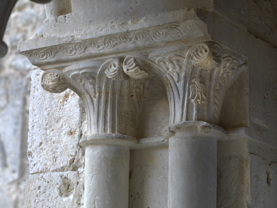 Coppia di colonnine con fusto in marmo e basi e capitelli in pietra calcarea. I capitelli sono a foglie scanalate (quello di destra è decorato con un'aquila) con terminali a caulicoli a foglie e fiori, alternate a motivi di fiori di giglio rovesciati. Plinto decorato con cornice a girali