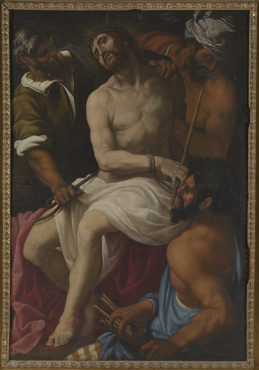 Personaggi: Cristo. Figure: manigoldi. Oggetti: corona di spine; canna; funi