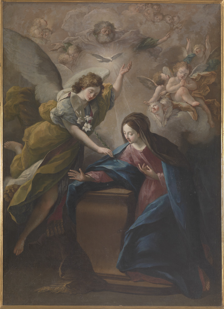 Personaggi: Maria Vergine; San Gabriele arcangelo; Dio Padre. Figure: angeli; cherubini. Oggetti: inginocchiatoio
