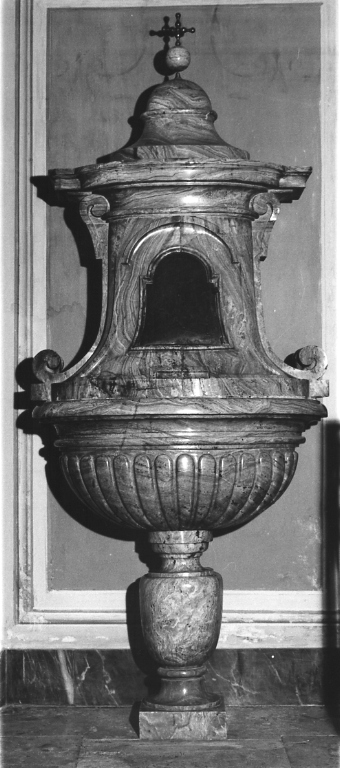 Fonte a forma di anfora, vasca baccellata, parte superiore a volute e sormontata dalla croce