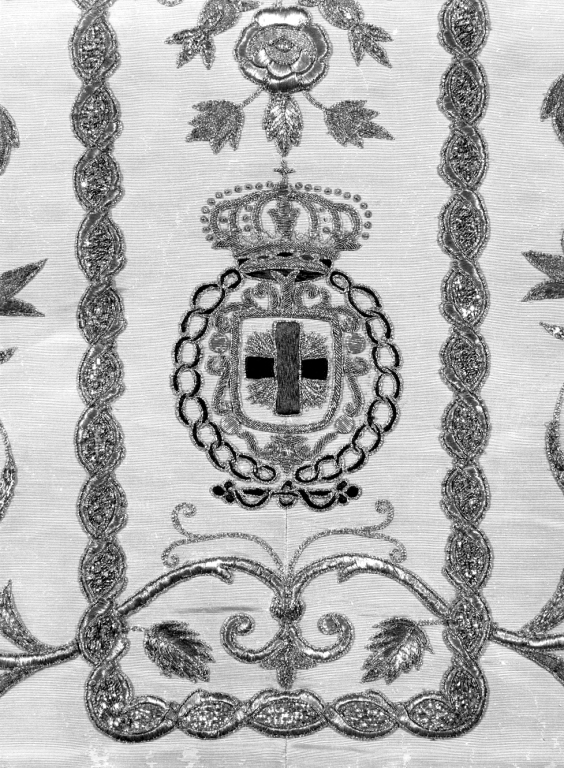pianeta con motivi decorativi costituiti da tralci di fiori intersecantesi, spiga di grano suddivisi in tre bande verticali