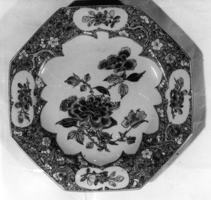 piatto ottagonale su breve piede ad anello decorato con smalti policromi sopra coperta con la raffigurazione al centro di peonie su fondo bianco. Sulla tesa vi è un fittissimo fondo di piccole volute su cui si stagliano fiori di ciliegio e ramoscelli e quattro riserve a forma di melograno e zucche con fiori