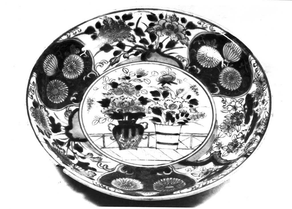 piatto a parete curva su basso piede. Decorato, in blu cobalto sotto coperta e smalti rosso e oro sopra coperta, con la raffigurazione al centro di due vasi 'manakago', uno in porcella ed uno in legno, con peonie il tutto dentro due cerchi. Sul bordo tre riserve a fondo blu con crisantemi e negli spazi di risulta fiori di peonia e rocce. Sulla parete esterna fiori di crisantemi