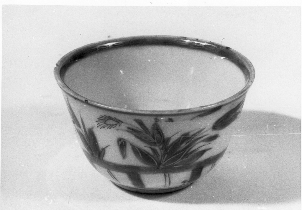 a parete curva su breve piede ad anello decorata in blu cobalto sotto coperta e smalti rosso e oro, con la raffigurazione di una staccionata con spighe di miglio e due uccelli