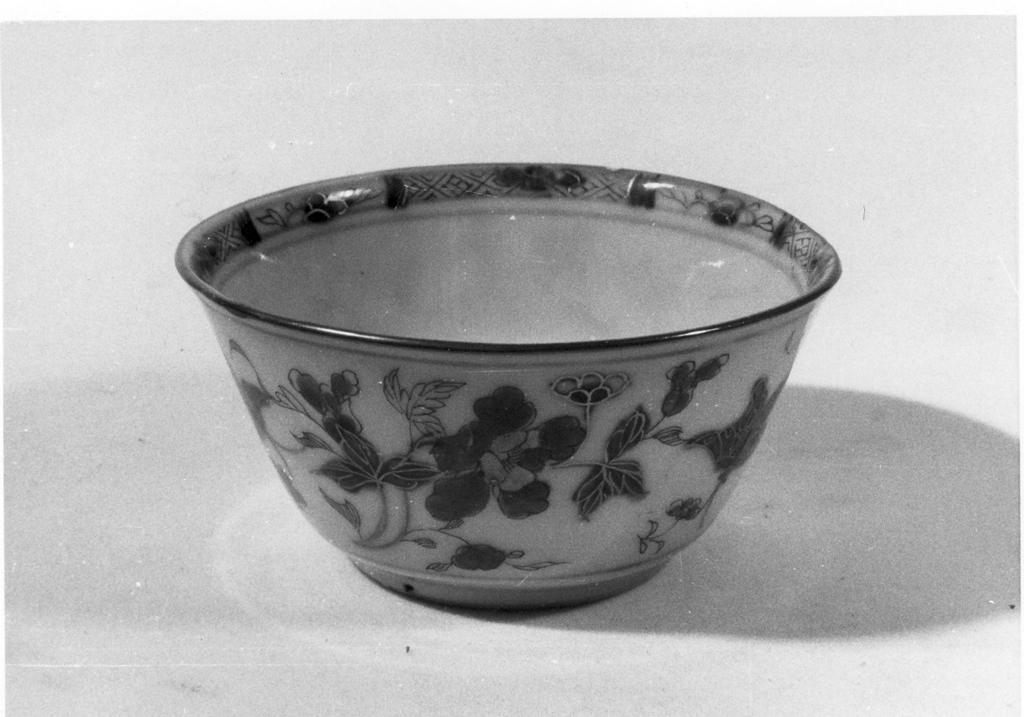 a parete curva, a parete curva su breve piede ad anello. Decorata in blu cobalto sotto coperta e smalti rosso e oro sopra coperta con all'interno sul fondo circoscritto da un doppio cerchio blu un fiore e al bordo fascia con elementi geometrici e floreali. All'esterno tre fiori di peonia intervallati a tre farfalle