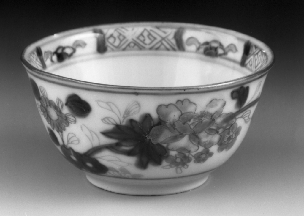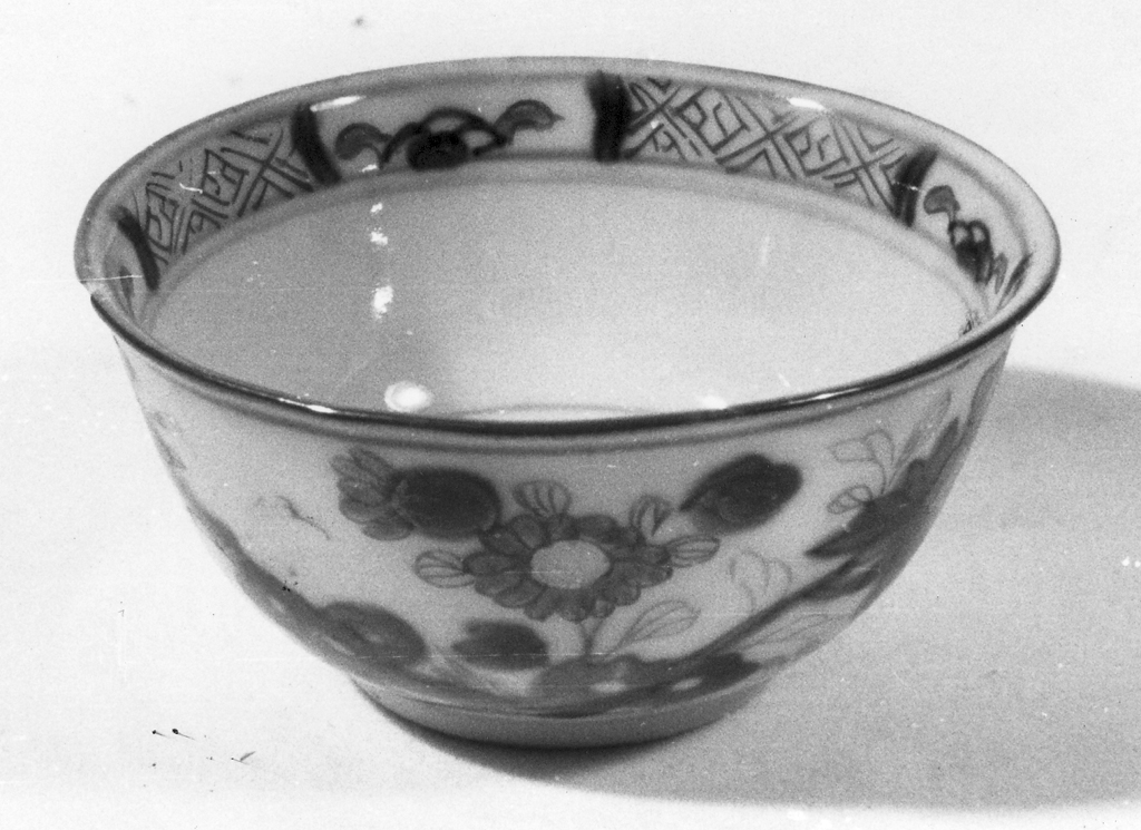 a parete curva su basso piede. Decoro in blu cobalto sotto coperta e smalti rosso ed oro con all'interno sul fondo un fiore di peonia circoscritto, fra due filetti blu con un motivo di losanghe in rosso interrotto da quattro riserve con un fiore. sulla parete esterna un motivo con una roccia 'taihu', da cui si dipartono tralci di fiori con grandi peonie e crisantemi
