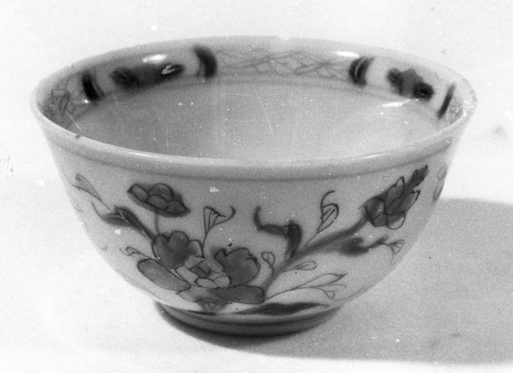 a parete curva su breve piede ad anello; decoro in blu cobalto sotto coperta e smalto rosso e oro sopra coperta, con la raffigurazione di rami fioriti presso uno steccato tra tre uccelli in volo