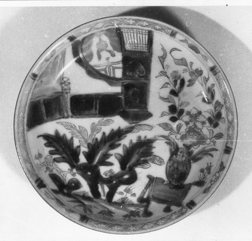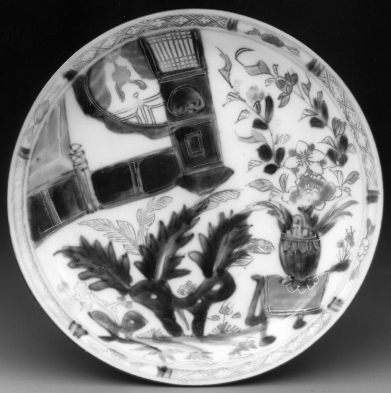 a parete curva su basso piede. Decorato in blu cobalto sotto coperta e smalti rosso ed oro sopra coperta, con la raffigurazione di un vaso di peonie poggiato su un tavolino quadrato vicino a rocce, foglie di banano e bambù; più in alto è raffigurata una terrazza. La parete esterna è rivestita da una coperta color marrone a lieve lustro