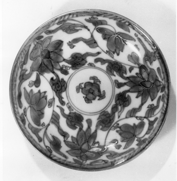 a parete curva su basso piede. Decorato, in blu cobalto sotto coperta e smalti rosso e oro sopra coperta, sul fondo un fiore all'interno di un doppio cerchio blu, e sulla parete curva si dispongono fiori di loto. Sulla parete esterna due fiori di peonia
