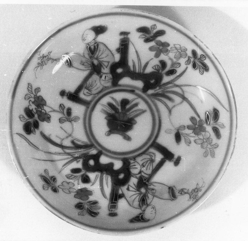 a parete curva su basso piede ad anello, decorata in blu cobalto sotto coperta e smalti rosso e oro sopra coperta, con la raffigurazione di due figure femminili sedute presso uno steccato con un fiore in mano tra fiori di ciliegio
