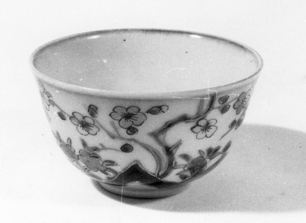 a parete curva su breve piede ad anello, decorata in blu cobalto sotto coperta e smalti rosso e oro sopra coperta, con la raffigurazione sul fondo di un mazzetto di fiori di ciliegio in un cerchio blu e, all'esterno, di rami fioriti con rocce e uno steccato