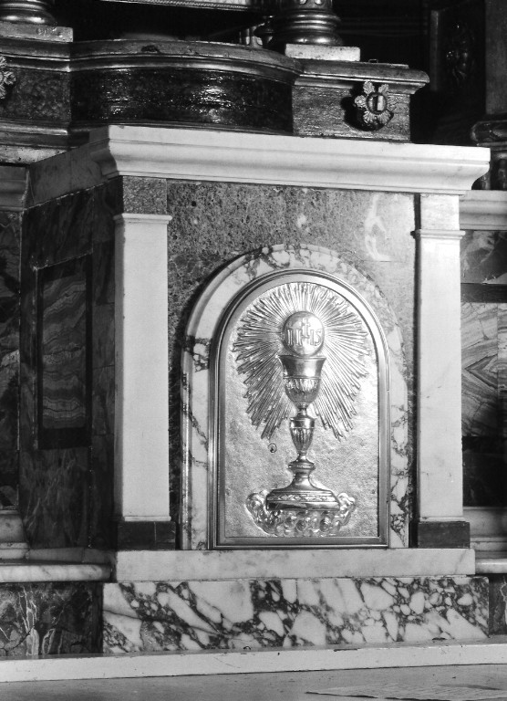 Tabernacolo con semplice decorazione a due lesene laterali. Sportelli in ottone con calice e ostia raggiata su nuvole