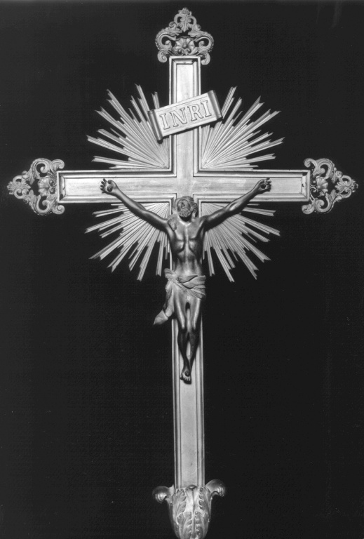 base a pianta triangolare su piedi leonini terminanti con foglia d'acanto. Sulle facce, riquadro satinato con le lettere "S A". Fusto a balaustro con foglie d'acanto, conchiglie, teste leonine con festoni floreali. Bocciolo a foglie d'acanto. La croce, raggiata, ha la terminazione dei bracci ornata da motivi floreali. Al centro l'immagine del Cristo crocifisso