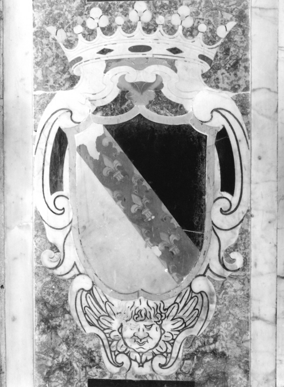 mensa in marmo bianco decorata sullal fronte da tre specchiature a cornici modanate, al centro croce in marmo giallo; sui pilastrini coppia di stemmi