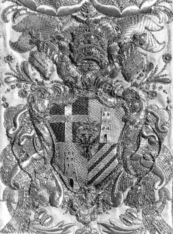 ricamo a racemi, al centro dello stolone motivo a piccoli rombi, in basso stemma, ai bordi volute fogliacee con fiori di diverse forme