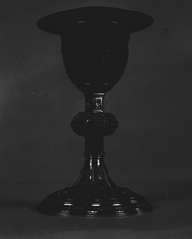 base polilobata decorata con applicazioni floreali; fusto con nodo con racemi contenenti rosette, coppa a racemi ed elementi floreali