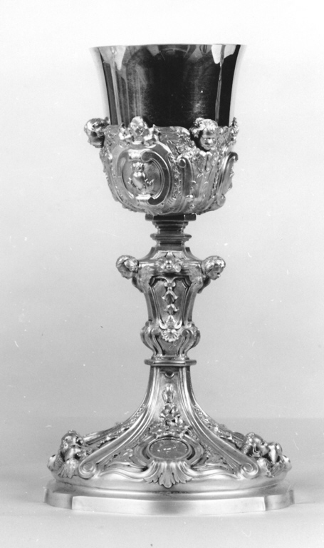 base contenente tre clipei con la Madonna Vallicelliana, san Filippo Neri e stemma del Comune di Roma alternati a teste cherubiche; fusto a nodo con tre cherubini e sottocoppa con cherubini alternati a clipei contenenti colomba, cuore fiammante e tre stelle